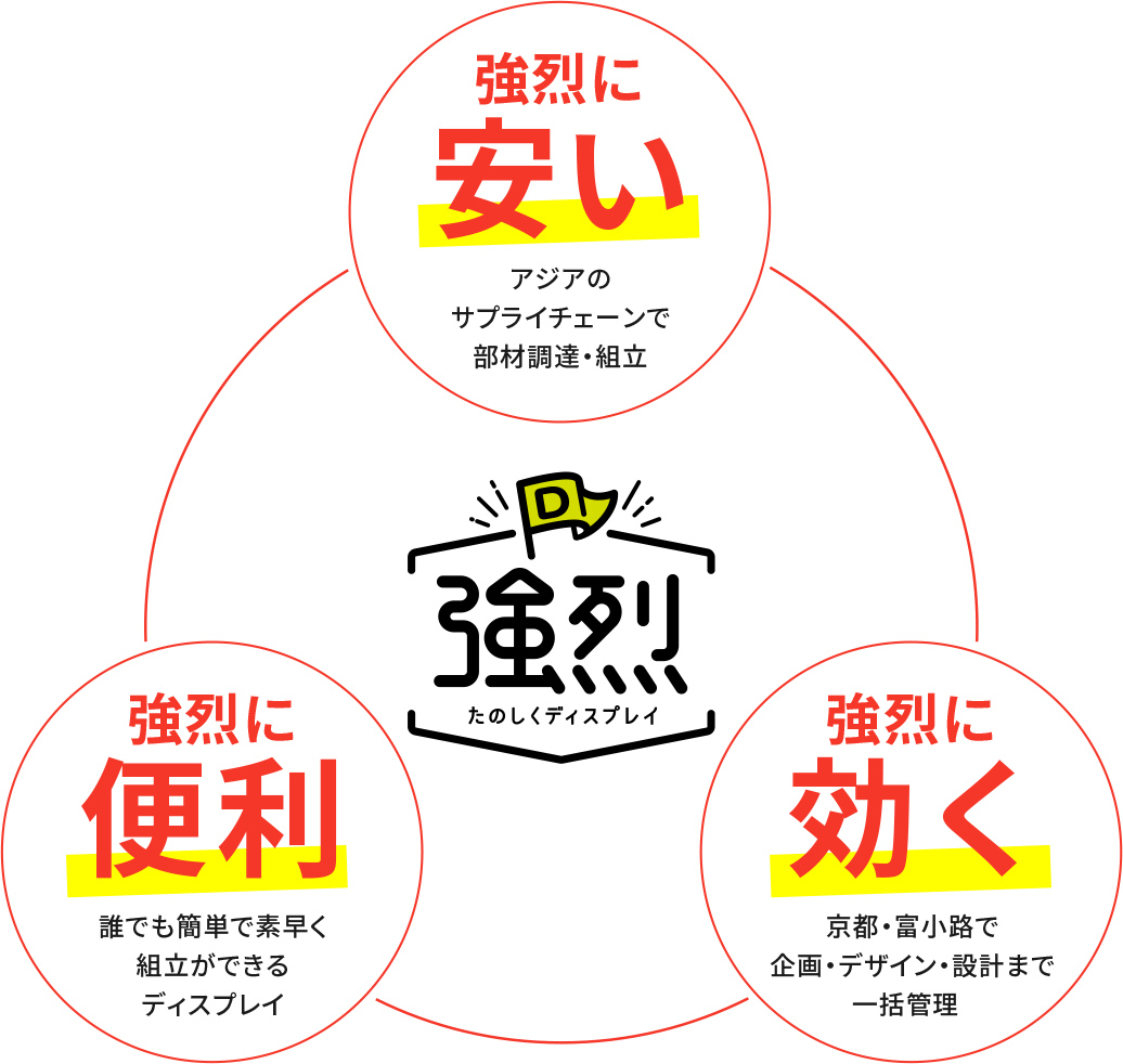「強烈」は、国内外にディスプレイ器具・出力の資材調達網を形成。特に、部材・組立においては、品質・価格を徹底調査、アジアにサプライチェーンを構築し、お客様へダイレクト発送。その強烈な価格は比較すれば、一目瞭然です。