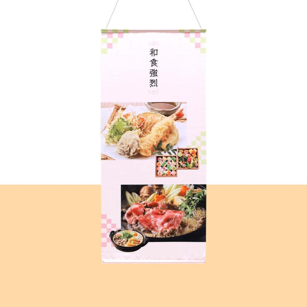 【ポンジ素材】を使用したタペストリーです。軽量で、向こうが薄く透けて見えるポンジ素材を活かし、店内で多く活用されています。