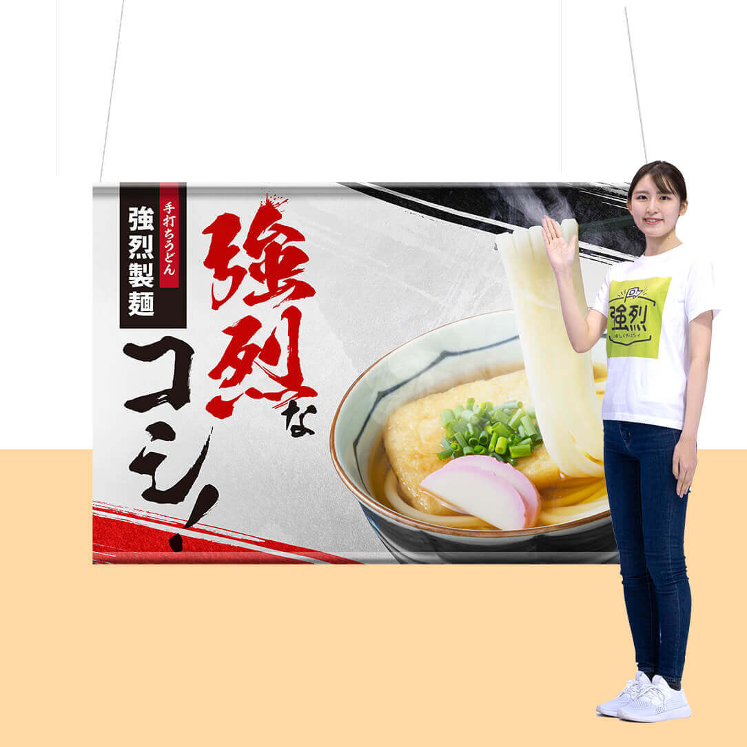 【ターポリン素材】を使用したタペストリーです。色褪せしにくいことも特徴で、【長期的】に使用する常設メニューのタペストリーにおすすめです。