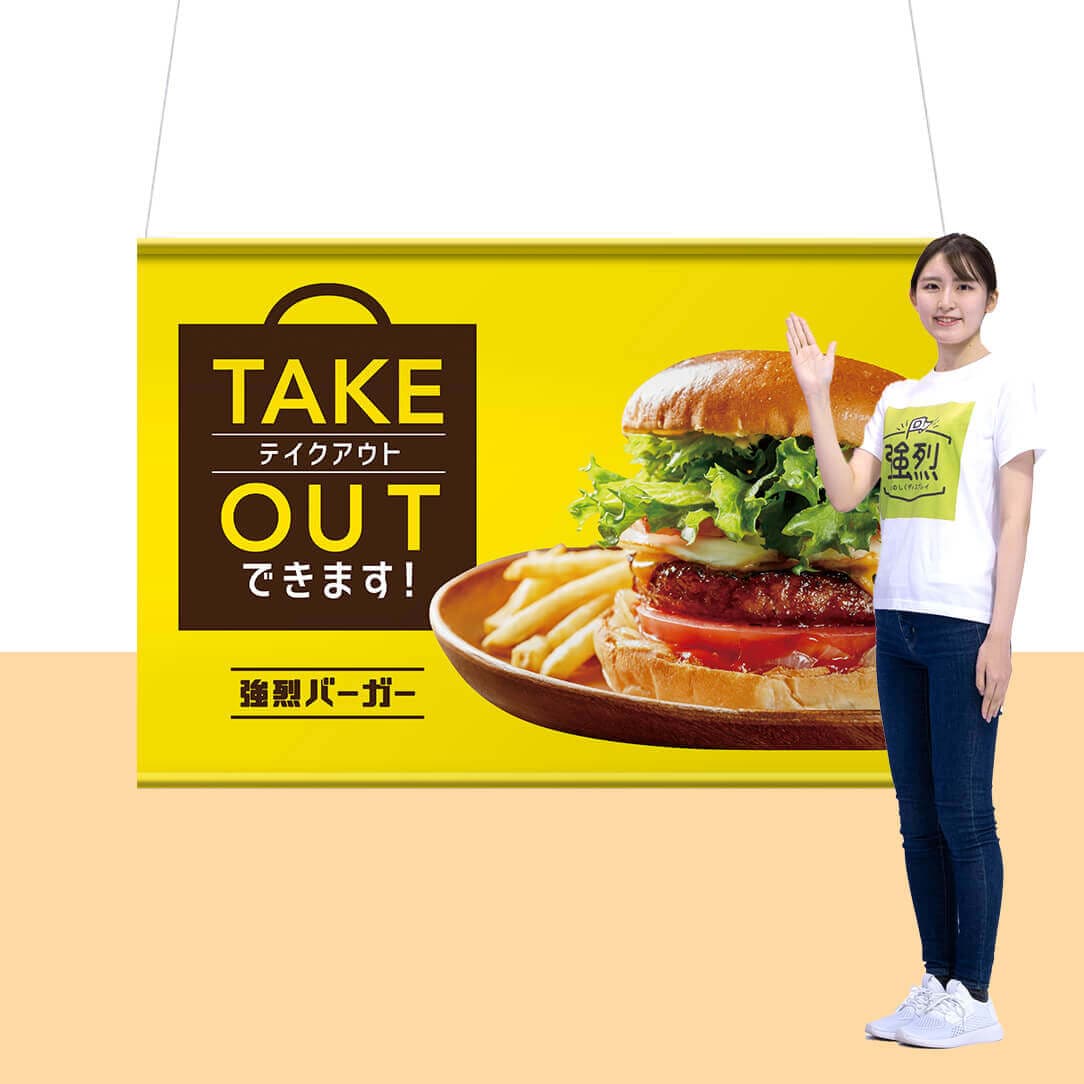 - 横長の大胆なデザインで新商品をアピール出来ます。駐車場や、縦長のタペストリーが設置できない店舗におすすめ。