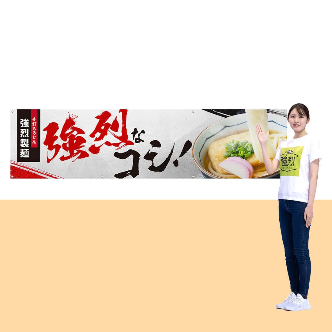 【ターポリン素材】を使用したタペストリーです。色褪せしにくいことも特徴で、【長期的】に使用する常設メニューのタペストリーにおすすめです。