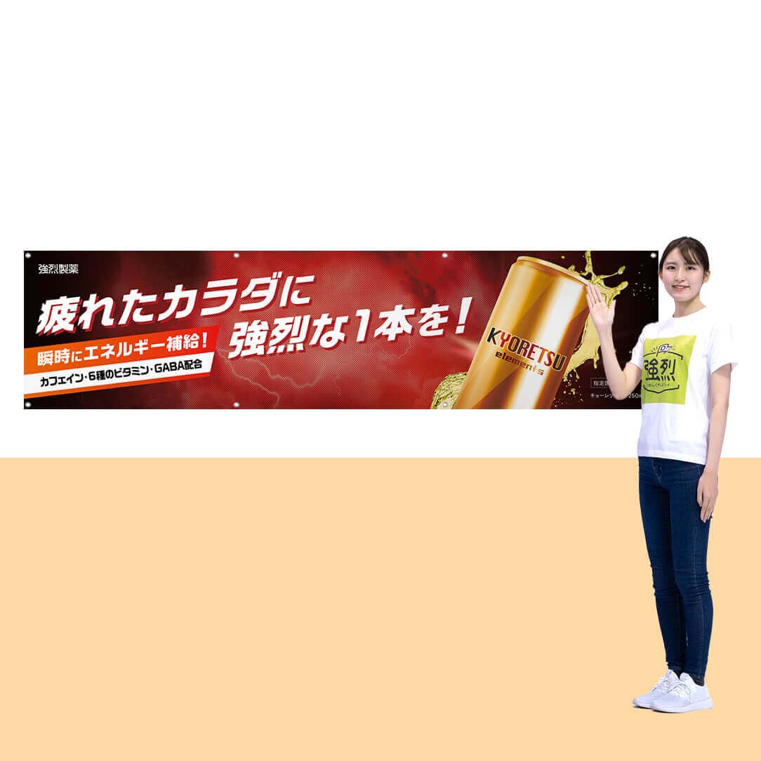 - 横長の大胆なデザインで新商品をアピール出来ます。駐車場や、縦長のタペストリーが設置できない店舗におすすめ。