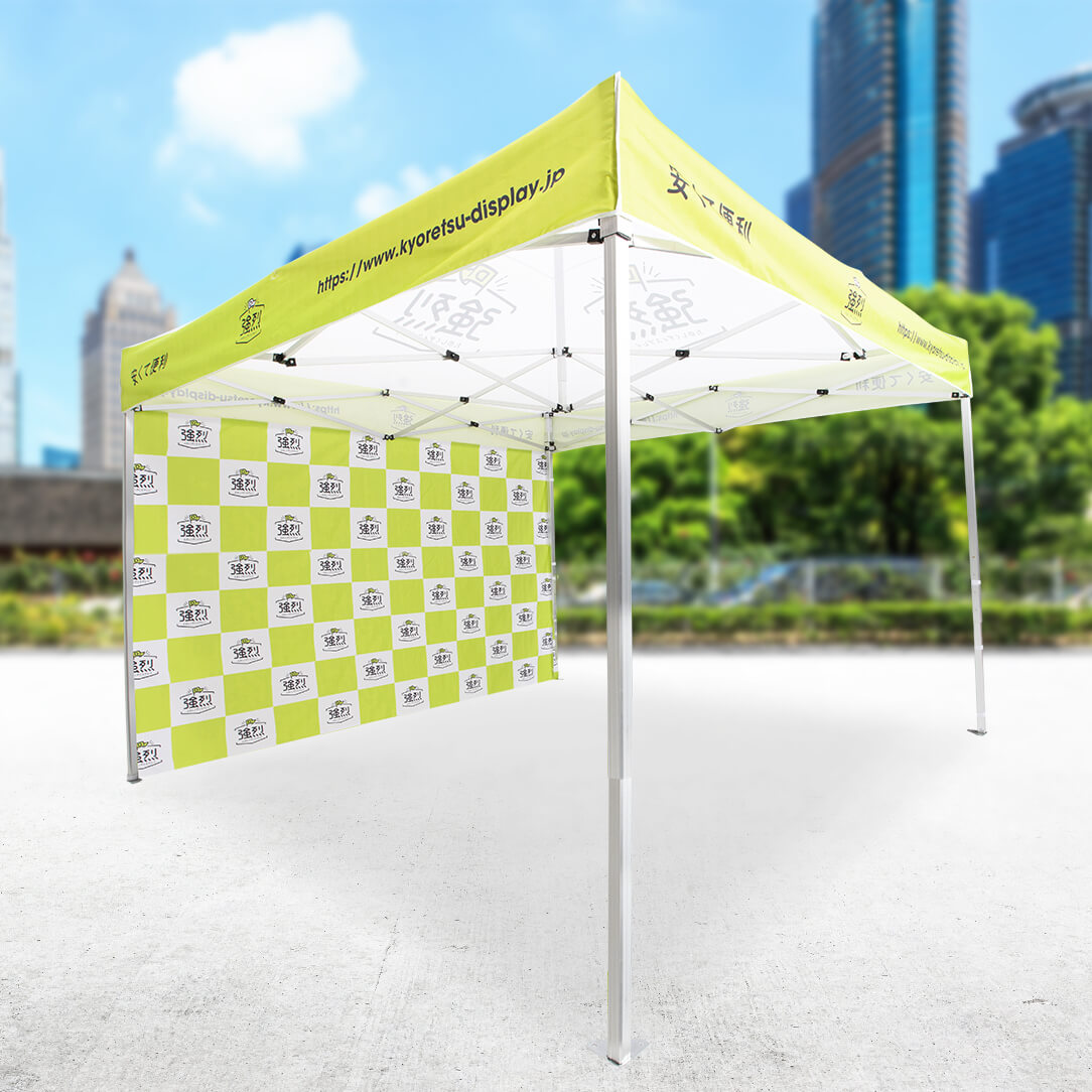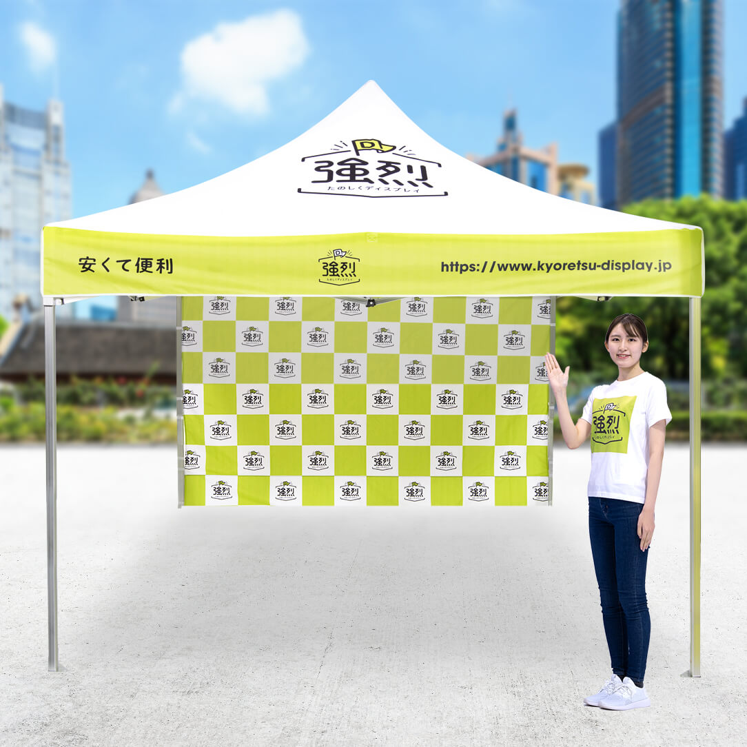 - 様々なブースが並ぶ屋外イベントでも、オリジナルテントで回りに差を付けます。