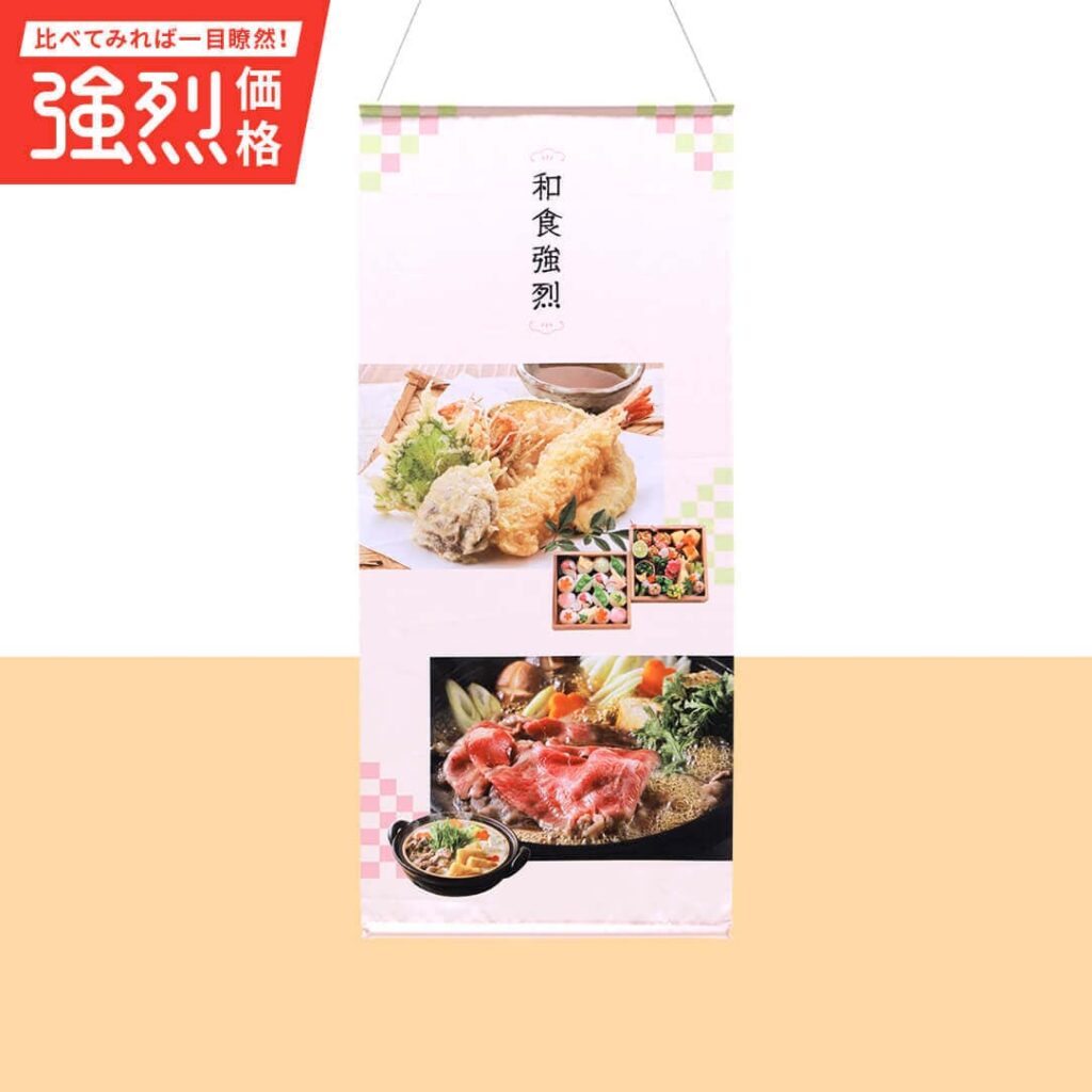 【合成紙】に片面ラミネート加工を施したタペストリーです。発色の良さが特徴で、売り出したい新商品におすすめです。