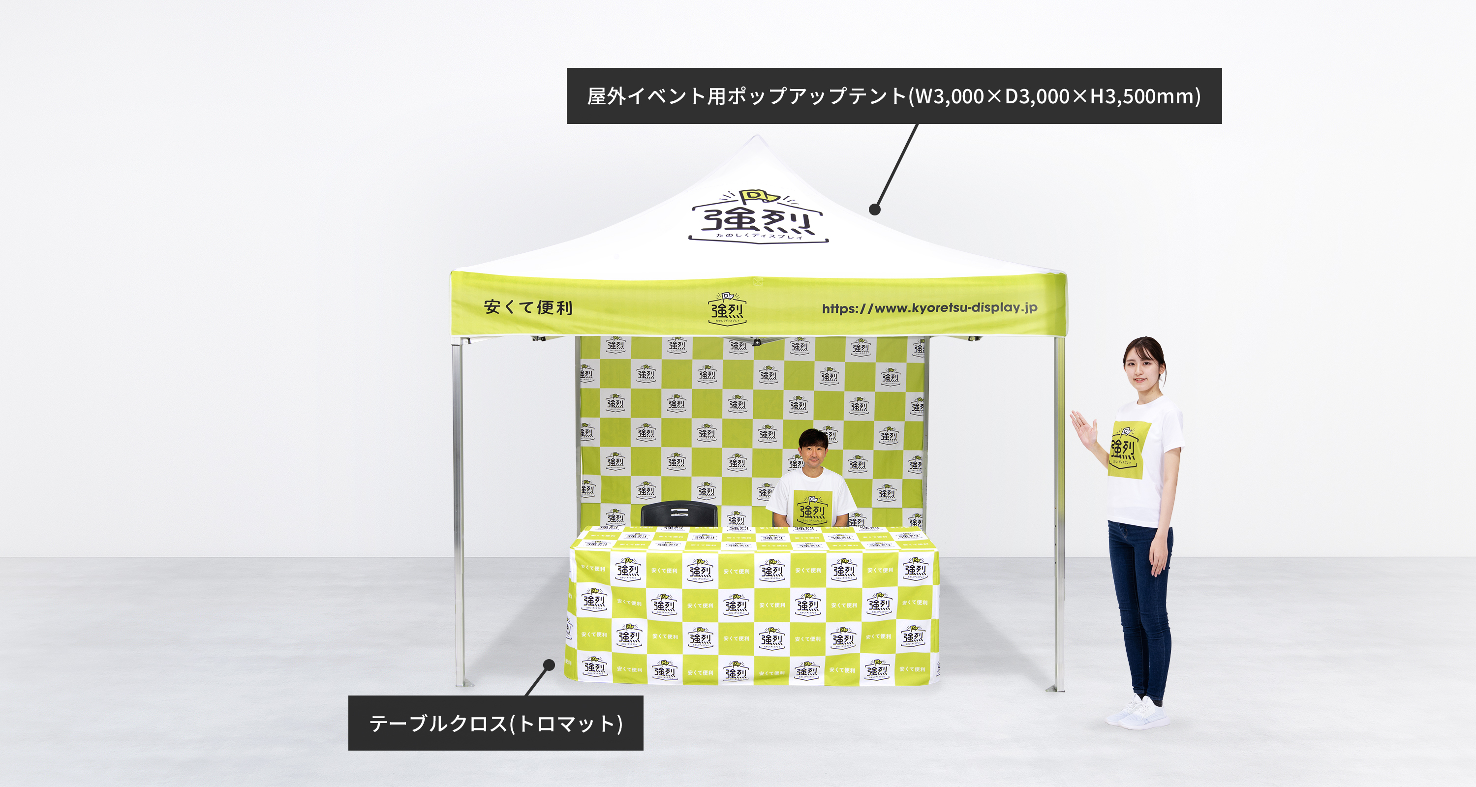 屋外イベントでは、遠くからでも目立つブースづくりが重要です。離れたところからでもパッと目に付く、屋外イベント用セットをご用意しました。テントの屋根をブランドカラーに染めれば、遠くからでも視認性抜群!さらに両サイドにバナーを取り付けることで、通り過ぎる来場者の目にも止まります。遠くからでも近くからでも集客効果を発揮する、屋外ブースが完成します!