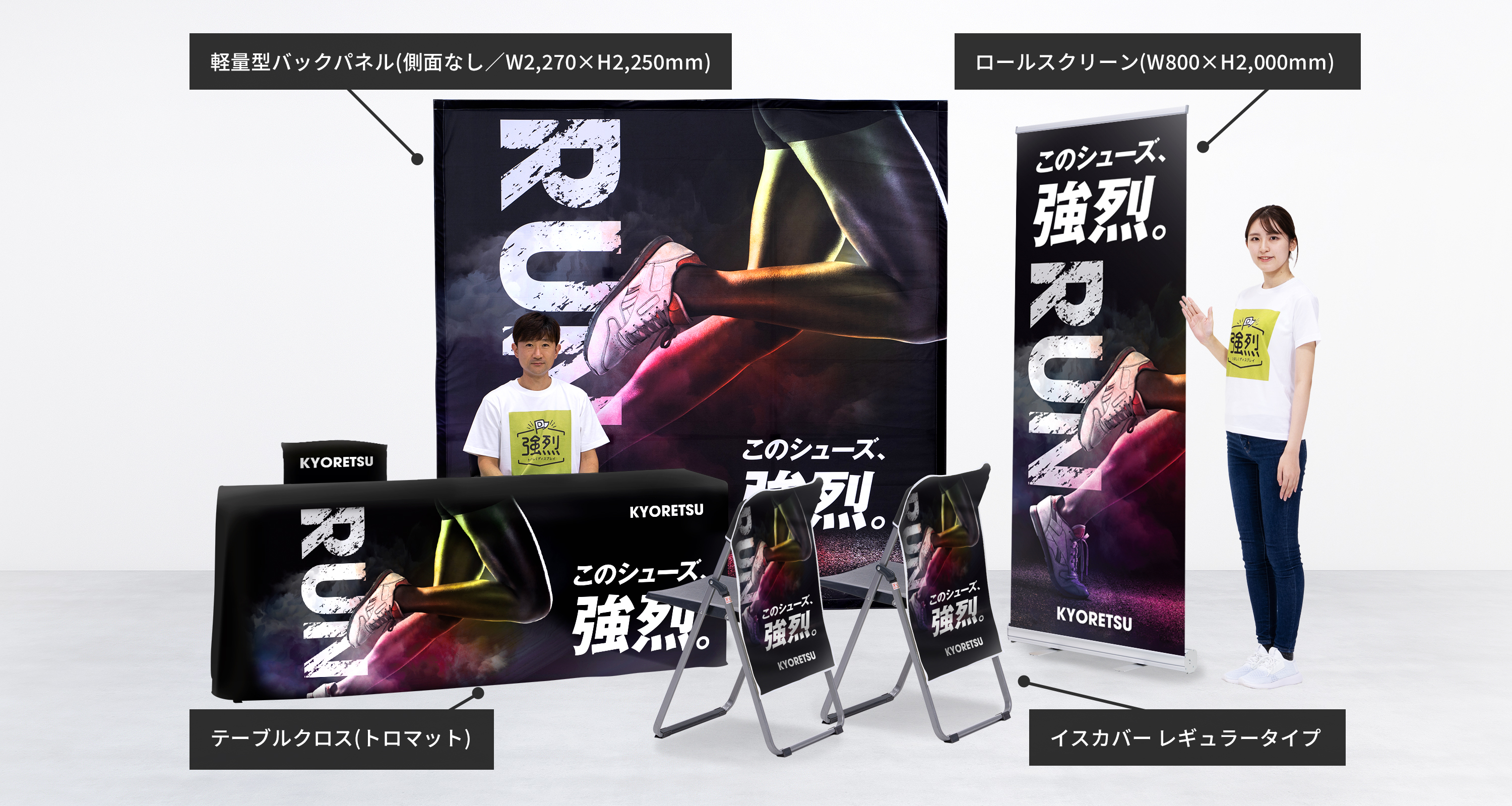 「お客様に素通りされてしまう」「お店のにぎやかさの中で目立てない」とお悩みの方へおすすめの商業施設専用セットです。デザインとインパクトの統一感で、しっかり目立ってアピールできるイベントに!