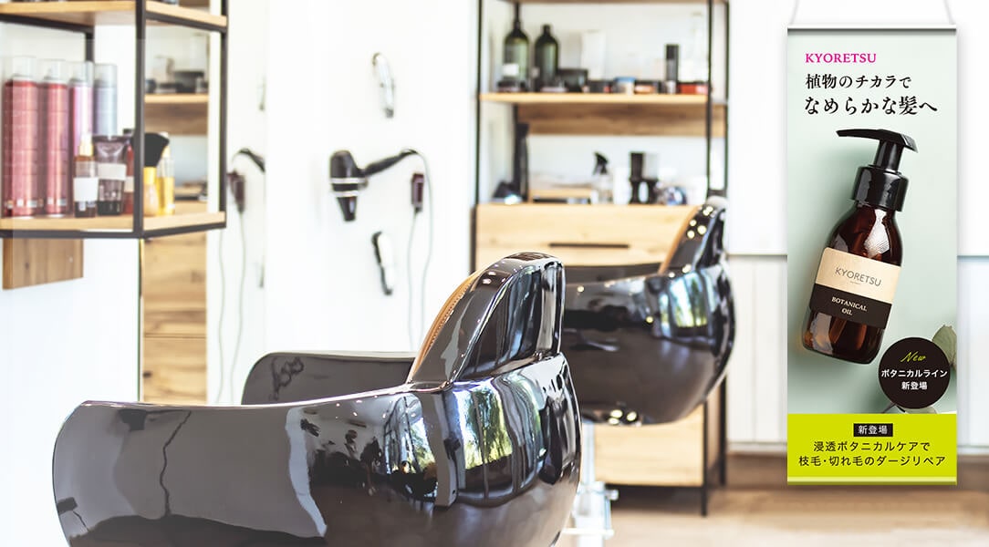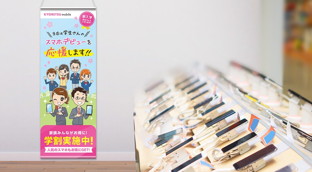 【ポンジ素材】を使用したタペストリーです。軽量で、向こうが薄く透けて見えるポンジ素材を活かし、店内で多く活用されています。