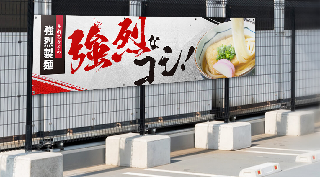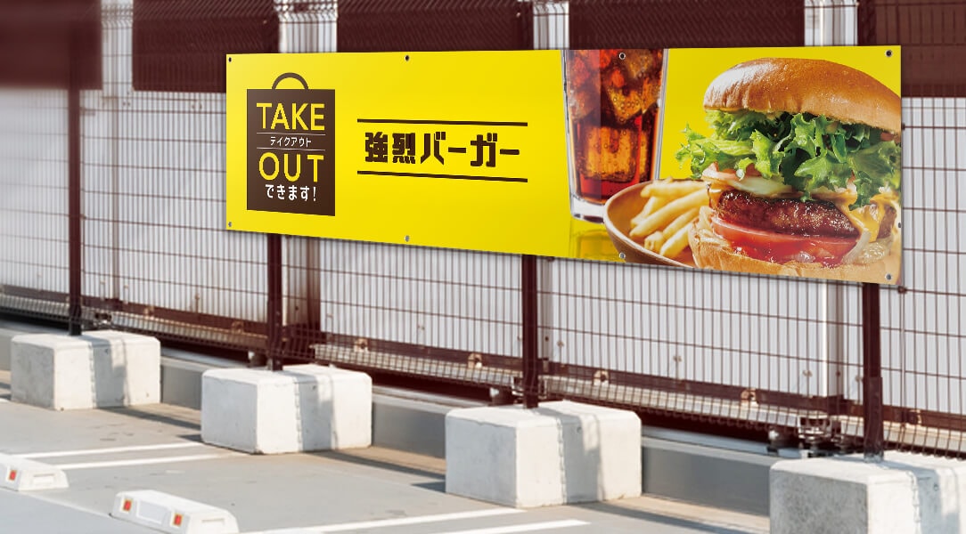 - 横長の大胆なデザインで新商品をアピール出来ます。駐車場や、縦長のタペストリーが設置できない店舗におすすめ。
