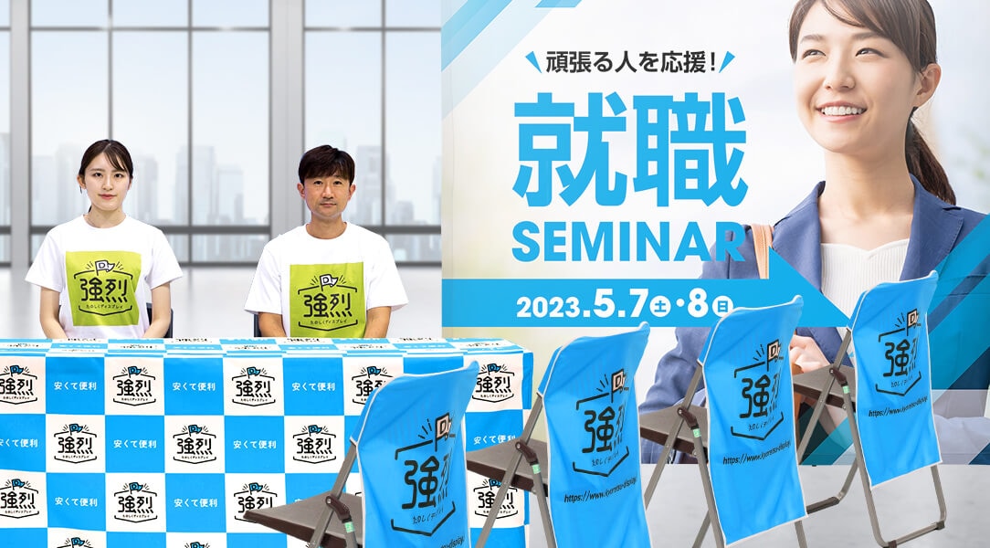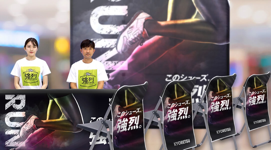 かぶせるだけでイスが広告に早変わりする便利アイテムです。ブースへ立ち寄りやすい雰囲気を生み出します。